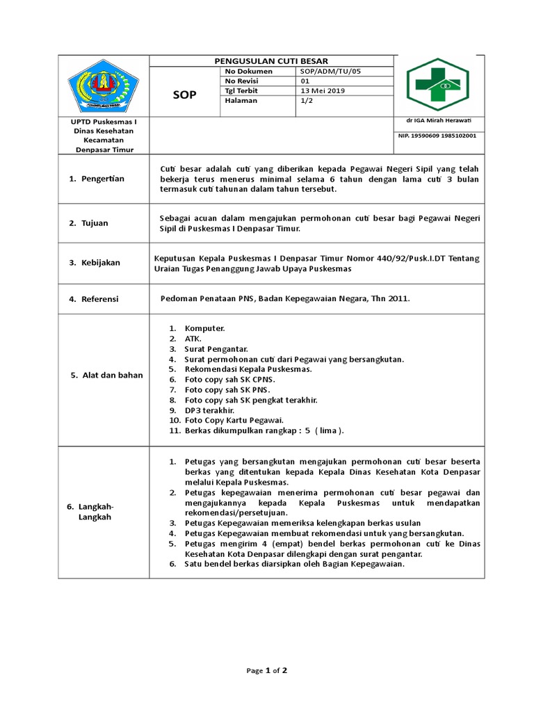 Apakah cuti besar adalah cuti besar? Cuti penting adalah cuti yang diberikan kepada karyawan yang memiliki acara penting seperti menikah, keluarga meninggal, membaptis, dan sebagainya. Nov 04, 2014 · jenis cuti, syarat dan kelengkapan berkas. Apakah masa pengajuan cuti besar? Pengolah data mutasi memeriksa kelengkapan berkas permohonan, jika ada kekurangan berkas, pengolah data mutasi menghubungi perangkat daerah untuk melengkapi berkas. Mar 30, 2016 · contoh permintaan cuti besar | berkas sekolah. Jika berkas permohonan sudah lengkap, pengolah data mutasi membuatkan konsep surat izin cuti untuk ditanda tangani oleh pejabat yang berwenang menandatangani cuti 8. Jul 29, 2015 · istirahat panjang. Cuti akan gugur jika tidak diambil selama periode tersebut. Pada dasarnya pengusaha wajib memberi waktu istirahat dan cuti kepada pekerja/buruh.1 salah satu waktu istirahat dan. Apr 13, 2021 · pemohon ( pengelola data kepegawaian skpd) menyerahkan berkas usul pembuatan usul cuti kepada kepala bkpsdm melalui penerima surat /agendaris. Cuti besar sendiri adalah cuti yang diberikan kepada karyawan yang sudah bekerja minimal 6 tahun terus menerus pada perusahaan yang sama. Adalah dokumen milik pemda provinsi setempat dan karena itu tidak boleh mencoret.