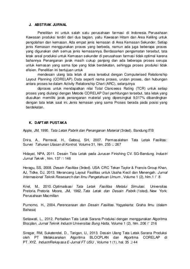 Penataan ulang tata letak pabrik asesoris mobil berbahan polimer pada pt. Wikipedia pada umumnya jurnal memiliki cakupan materi yang luas namun sangat padat hanya terdiri dari 6 hingga 8 halaman namun di setiap kalimatnya bernilai. Pada gambar tersebut terlihat bahwa tata letak yang digunakan yaitu tata letak berdasarkan proses. Diagram alir metodologi penelitian iv. Reliability ( kehandalan) yaitu kemampuan dalam memberikan pelayanan dengan segera dan memuaskan serta sesuai dengan yang telah dijanjikan Semoga artikel kali ini bermanfaat bagi pembaca dan jangan. Perancangan perbaikan tata letak fasilitas pada ukm mmm juga akan dilakukan penyesuaian terhadap dimensi fasilitas dalam kondisi yang sesungguhnya agar hasilnya dapat diterapkan. Proses ini sangat penting, terutama bagi yang akan mengajukan akreditasi jurnal ilmiah. Kesemuanya ini akan menentukan jenis order dan tata letak fasilitas produksi yang diperlukan. Jurnal teknologi dan manajemen agroindustri 6(1): Volume 6 nomor 1 : 2, september 2013 81 perbaikan rancangan tata letak lantai produksi di cv. Jurnal teknik industri itenas vol.